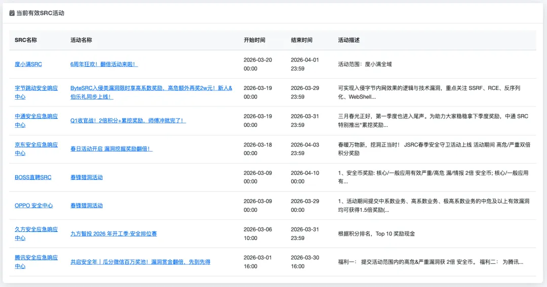 今日未发现新的 SRC 活动上线,目前在活动期内的 SRC 如下: