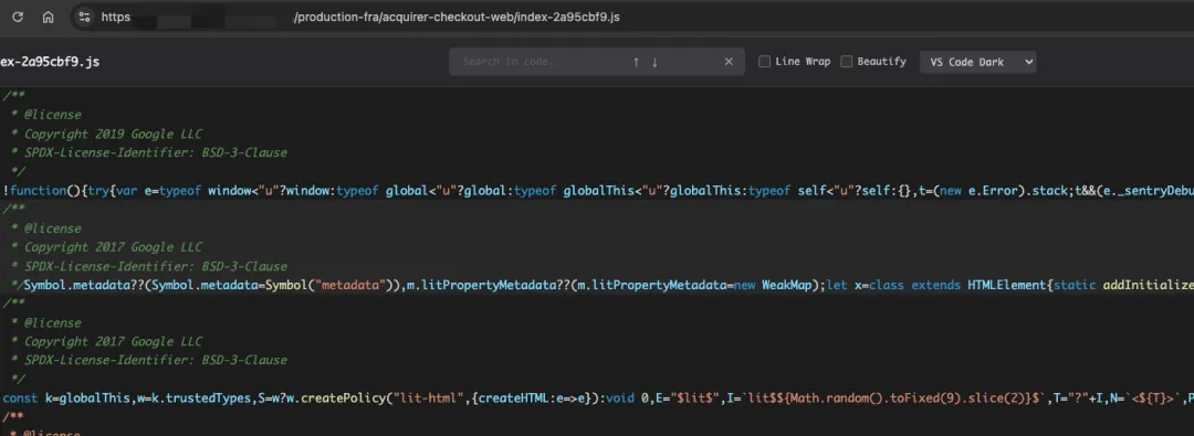 也有不少网站在发布系统时,没有将 .map 文件删除,导致 map 文件泄露,有了这个 map 文件就可以将混乱的 js 代码还原出来,比如原本的 js 文件内容是这样的: