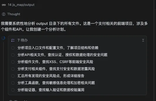 它在思考的过程也极具学习价值,看看如何分析其中的安全风险,部分结果如图: