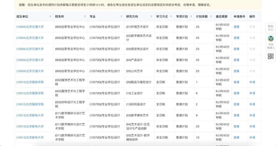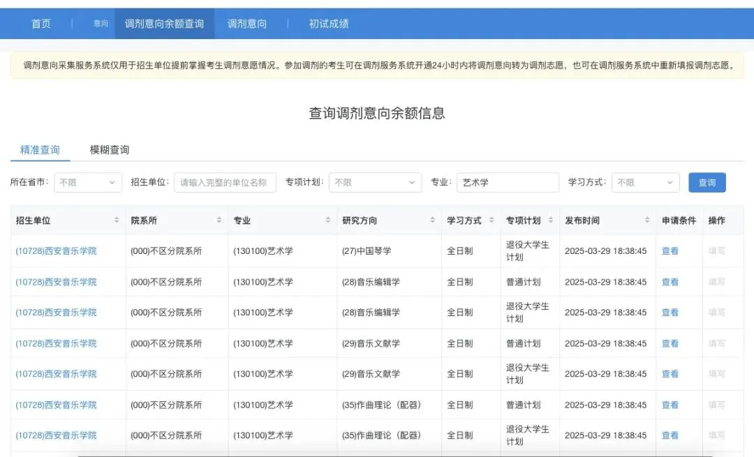 特别注意:在查询计划余额时,一定要查看清楚招生单位设置的调剂申请条件(比如,是否对一志愿专业或初试科目等有要求,是否仅招收全日制/非全日制、退役大学生士兵专项计划等),如果不符合招生单位的调剂条件而去申请调剂,不满足要求,招生单位在志愿锁定时间范围内有权不进行解锁,只会白白浪费一个调剂名额和调剂时间。