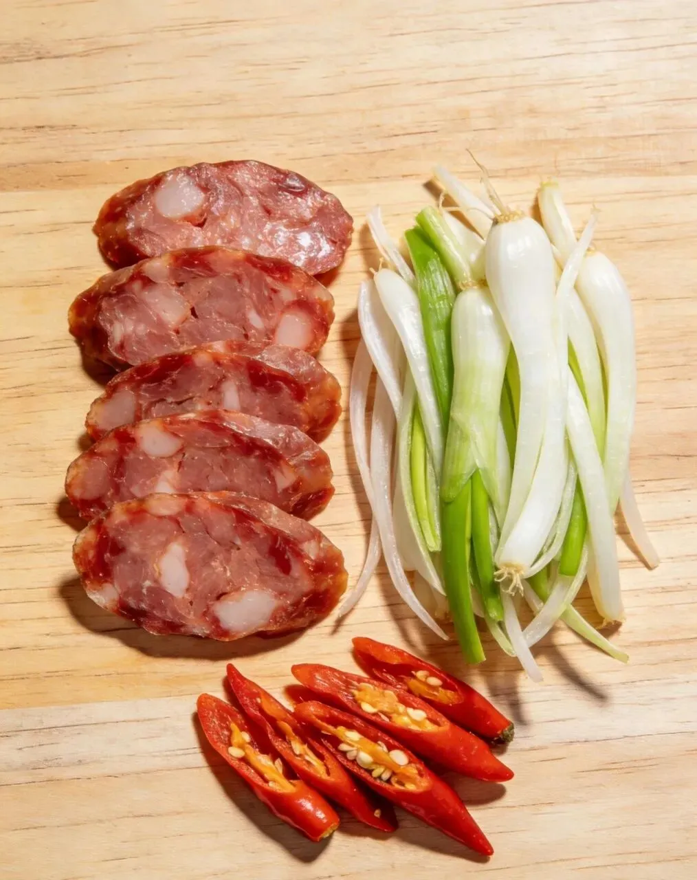藠头洗净切小段,严格分开藠头白(先炒)和藠头叶(后放);腊肠斜切片备用。