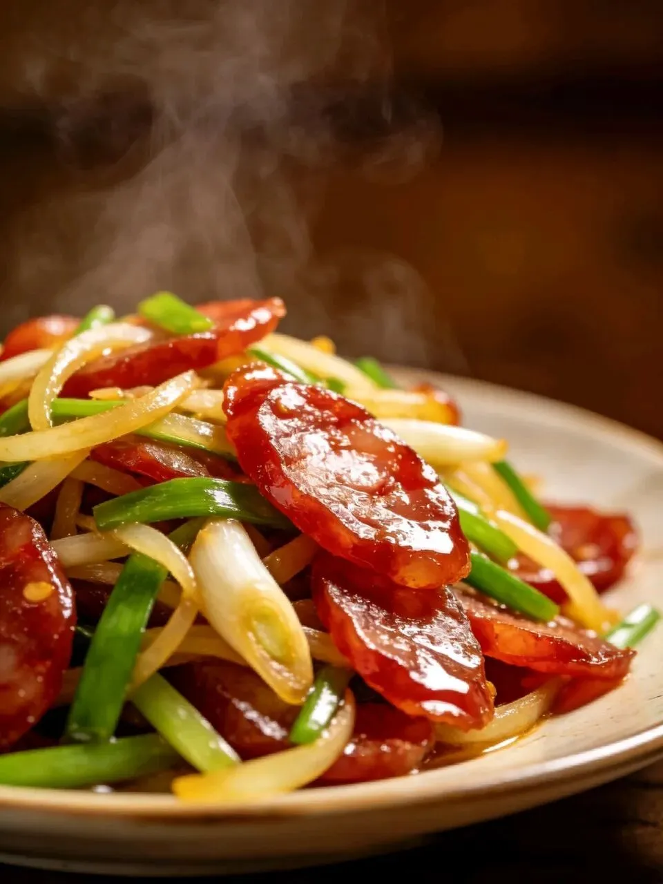 倒回炒好的腊肠,加少许盐和生抽(可选)翻炒均匀,最后放入藠头叶,大火快速翻炒30秒至变软,立刻关火装盘!