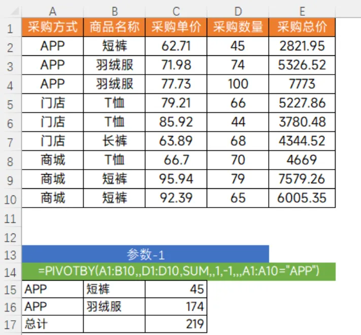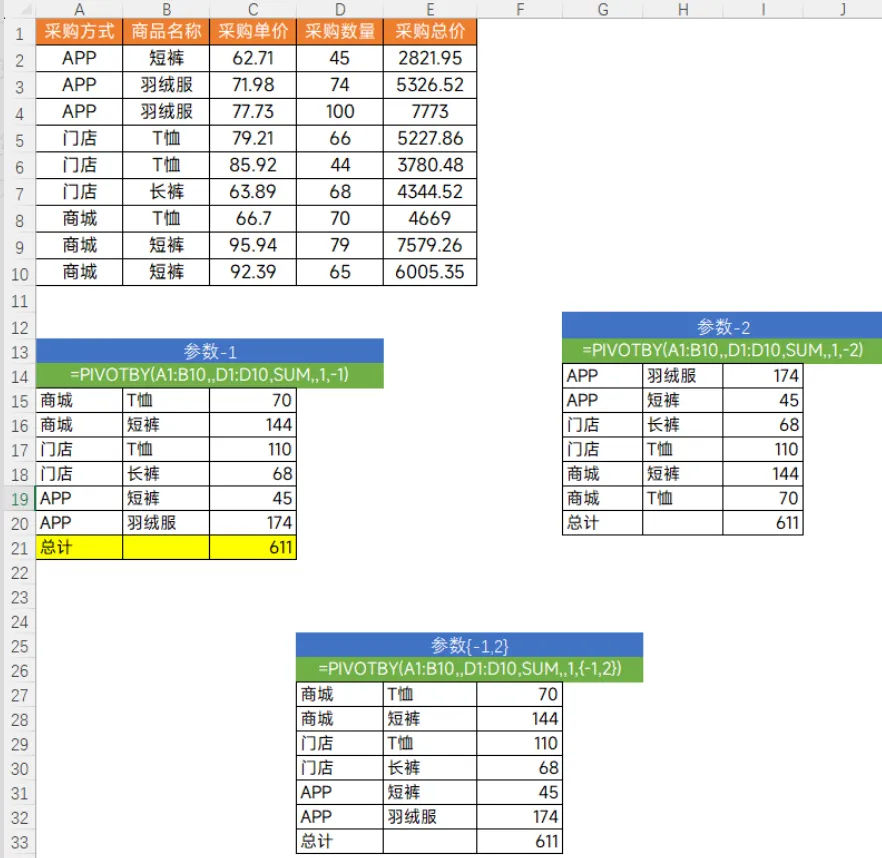 第一参数我直接选了A到B两列,把“采购方式”和“商品名称”都放进行标签。第三参数D到E两列,同时统计数量和金额。一个公式,两张表的数据全出来了。