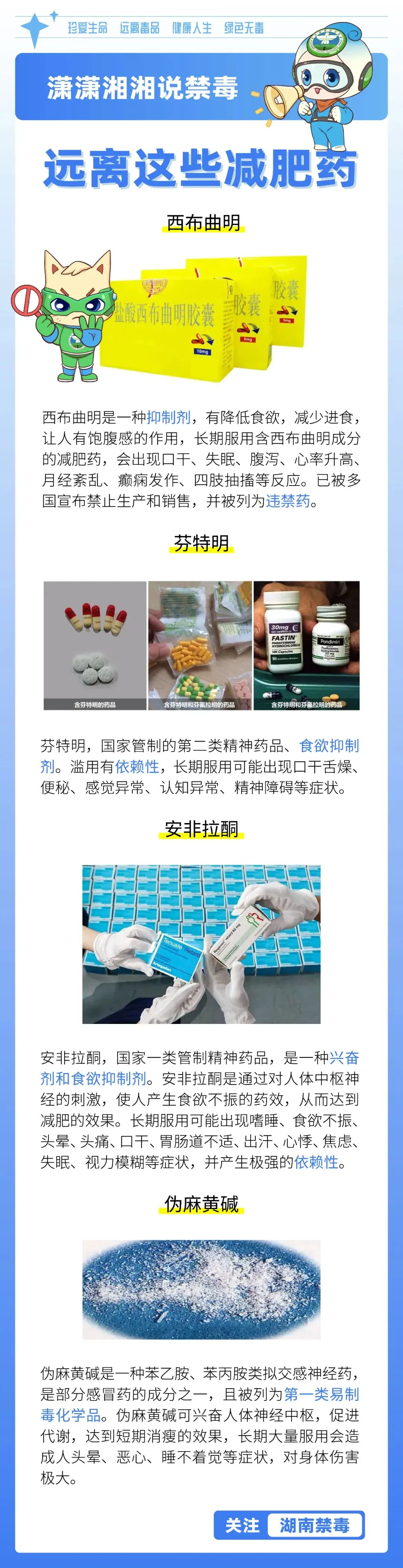 一些不法分子利用人们减肥心切的心理,在所谓“特效减肥药”“网红瘦身饮”中,偷偷添加麻黄碱、甲基苯丙胺(冰毒)、芬特明、西布曲明等国家明令禁止的毒品或精神管制药物。