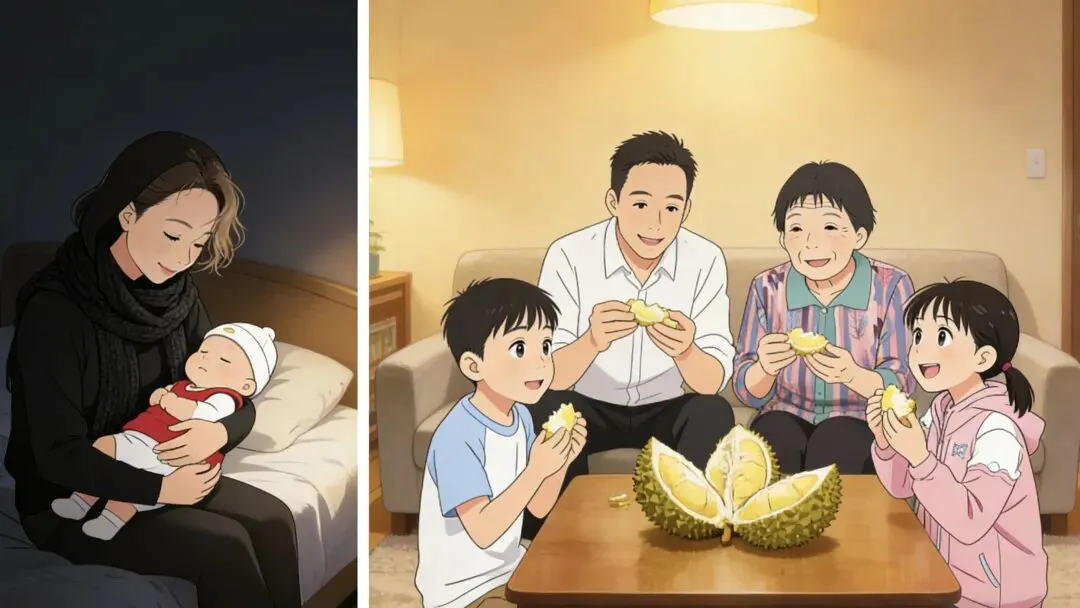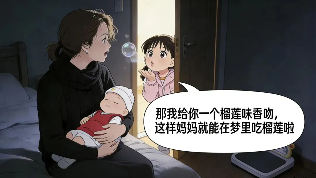“那我给你一个榴莲味的香吻,这样妈妈就能在梦里吃榴莲啦~”