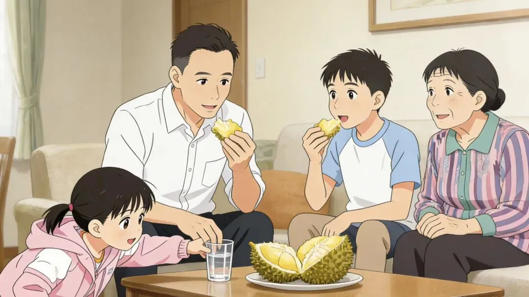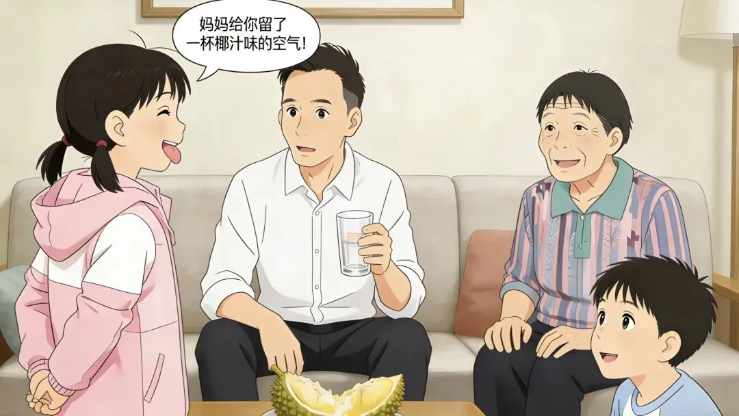 客厅里,爸爸正和家人分享着榴莲,女儿却偷偷拿走了他的椰汁,小心翼翼地捧到我面前。