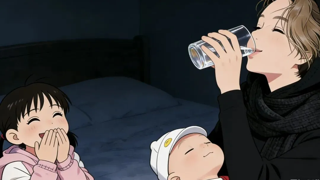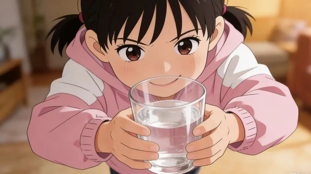 她蹦蹦跳跳回到客厅,把空杯子递还给爸爸,得意地说: