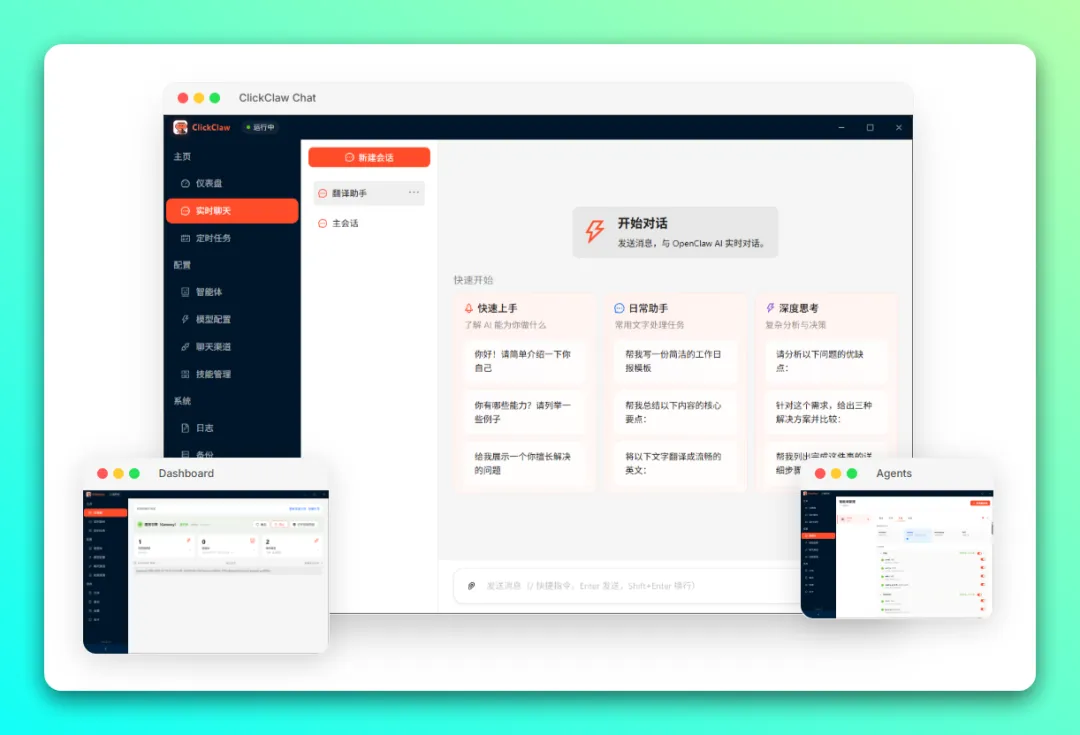 免费开源部署你的 OpenClaw 全能助手「ClickClaw」无需配置任何环境,小白也能 3 分钟搞定。支持 Claude、GPT、Kimi 等数十款模型,对接飞书、TG、Discord 等主流 IM 平台。