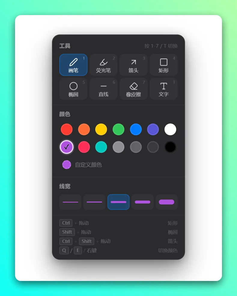 实时颜色切换:彩色光标实时显示当前画笔颜色,切换颜色后底部会短暂提示颜色名称。