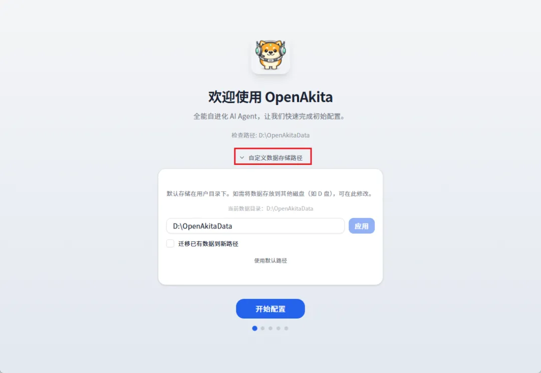 接下来它会自动弹出一个桌面应用,我们开始配置我们的ai助手,可以自己定义一个存储数据的路径,最好不要存储在C盘