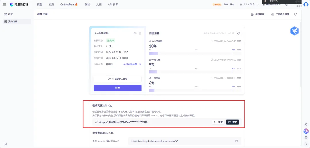 购买之后再我的订阅中找到专属的api key,这个就是我们大模型的使用钥匙。