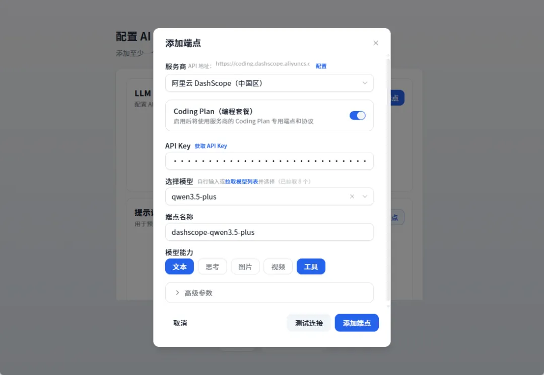 然后我们在openAkita的配置模型页面,配置一下我们的模型,选择Coding plan ,输入你的api key,这里模型可以使用qwen3.5-plus或者glm5.0,都是非常强的国产模型