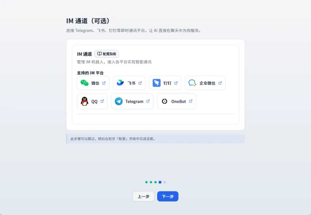 接下来可以配置一下IM通道,也就是可以直接让我们能够通过微信,qq等工具和ai通话的渠道,我们暂时跳过这一步,后面再来配置