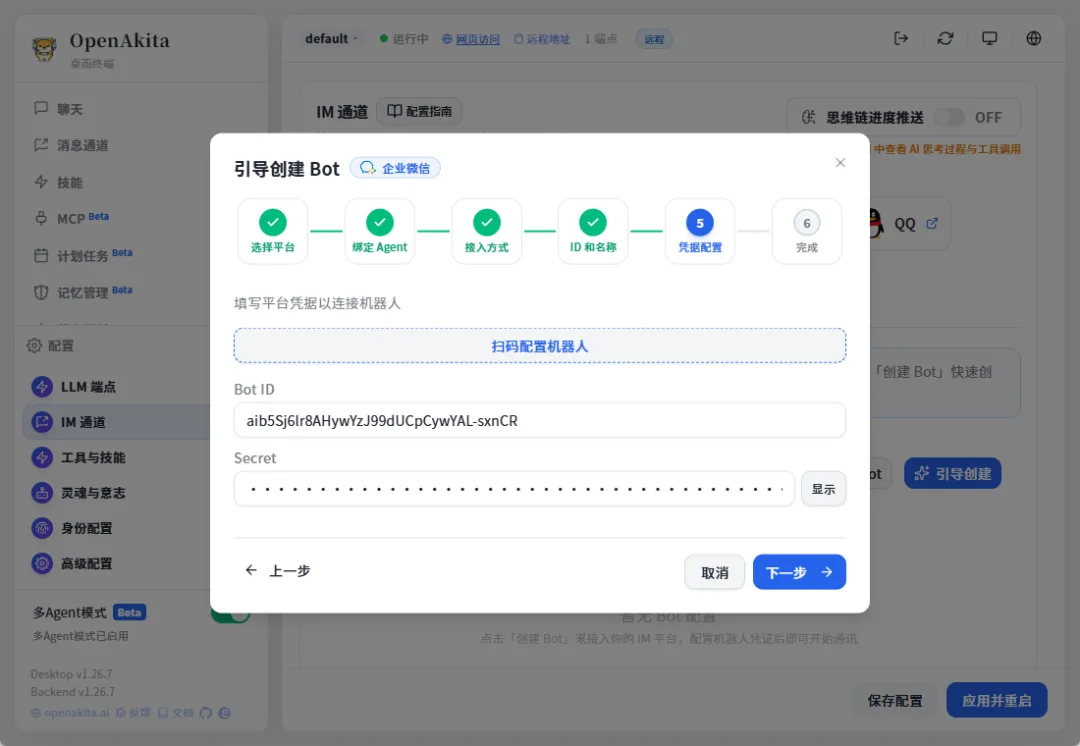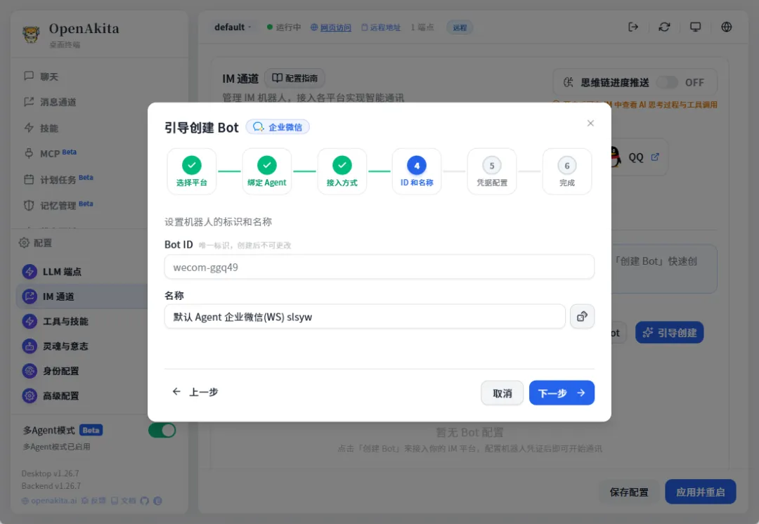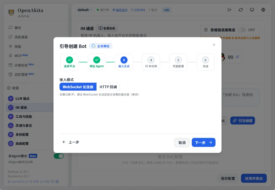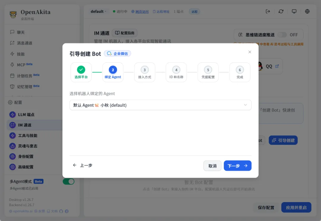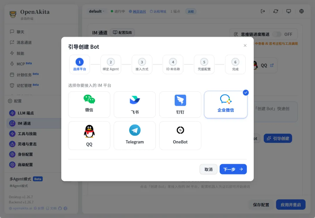 接下来我们配置一下IM工具,这样agent就可以和我们对话了,选择配置-IM通道,openAkita支持很多IM工具,我们以企业微信为例,尝试一下
