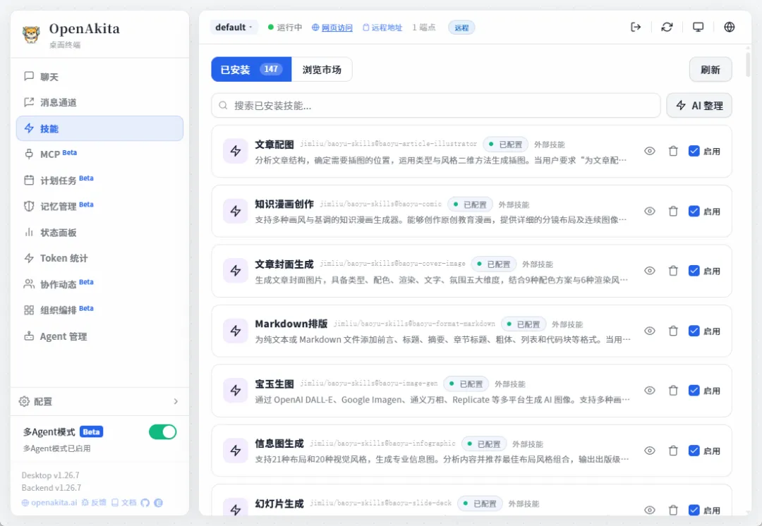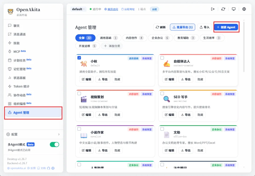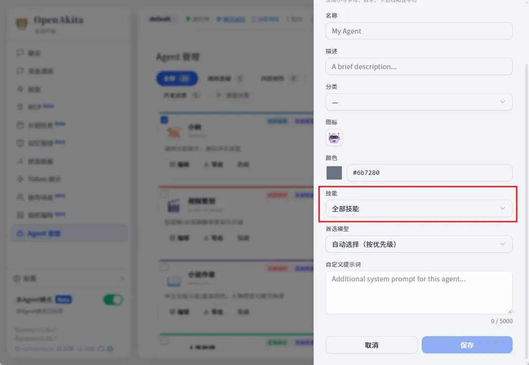OpenAkita安装skills非常方便,只需要创建一个agent,然后勾选全部技能即可
