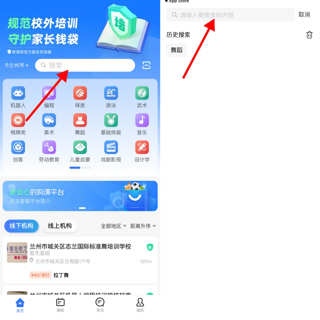 登录后进入首页→点击搜索栏→输入课程名称或者机构名称后点击搜索,即可查看搜索结果。