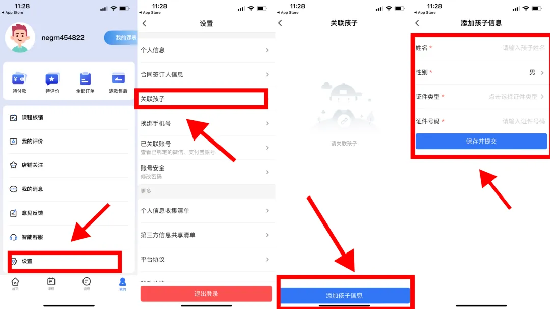 点击“设置”→点击“关联孩子”→点击“添加孩子信息”→输入姓名、选择性别和证件类型、输入证件号码、点击“保存并提交”。