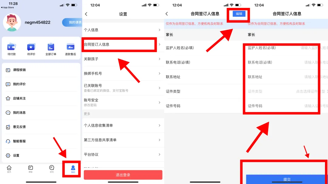 点击“设置”→点击“合同签订人信息”→点击“编辑”→输入监护人姓名、联系电话、联系地址、选择证件、输入证件号码、点击“提交”。