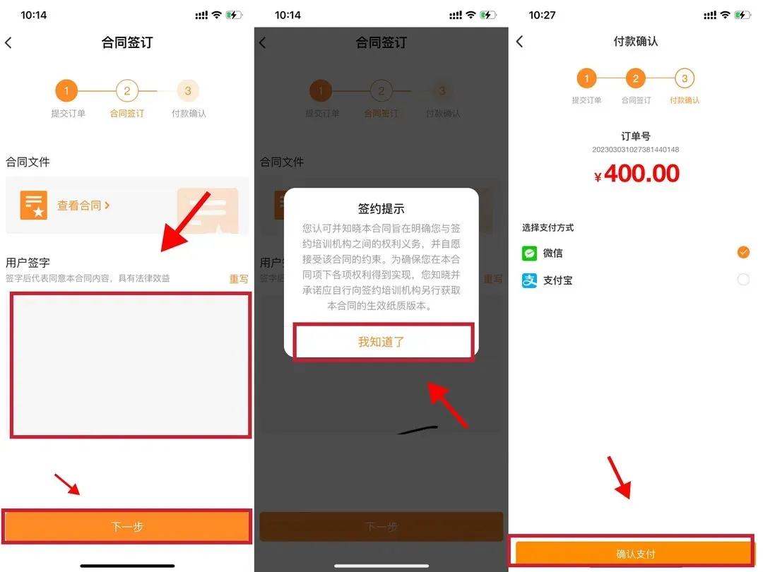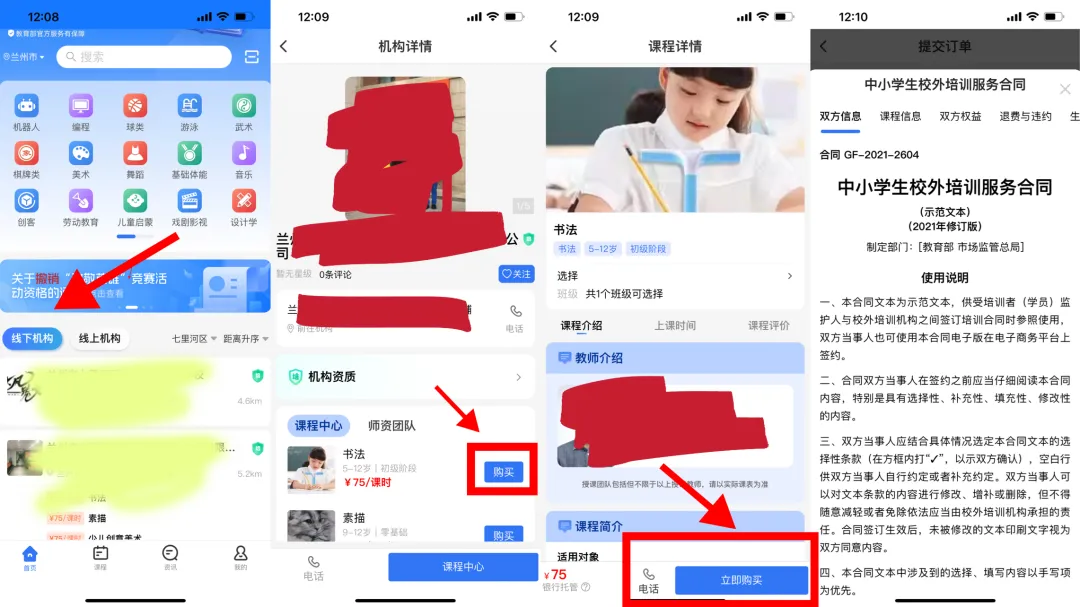 登录后进入首页→点击想要查看的机构→在想要购买的课程后点击“购买”(未提交合同签订人信息或关联孩子信息时会提示先进行信息关联)→点击“立即支付”→点击“下一步”→签订合同后选择支付方式并点击“确认支付”,支付成功后即可购买课程。