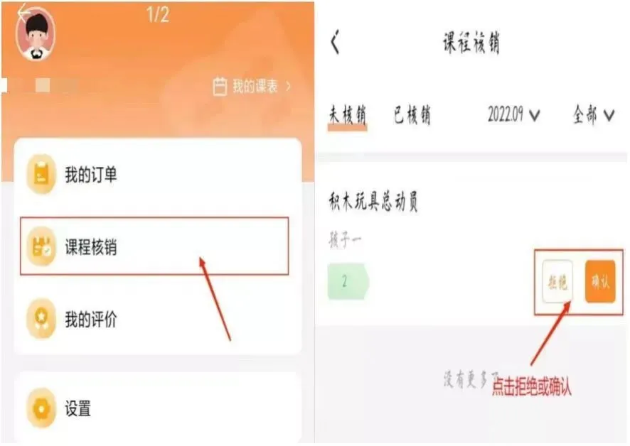 上完课后,培训机构发起消课申请。若孩子正常上完了本节课,家长需在家长端“我的”页面,“课程核销”中确认。“我的消息”里也会有消课信息提示。