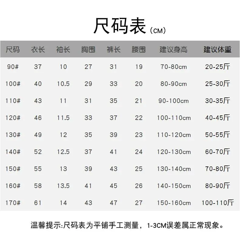 尺码表也给大家放在这了,90-170整整9个尺码,基本能适配各个年龄段的孩子。