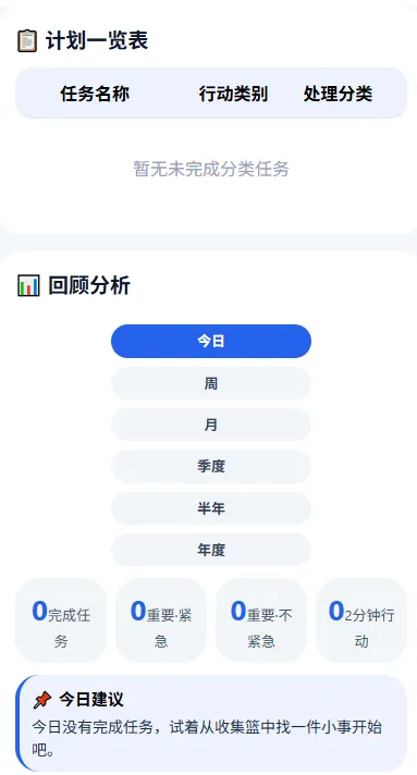 “本周未处理重要紧急事务,建议明天优先聚焦这类事务。”“今天完成了不少2分钟行动,效率很高!可以尝试挑战更大任务。”