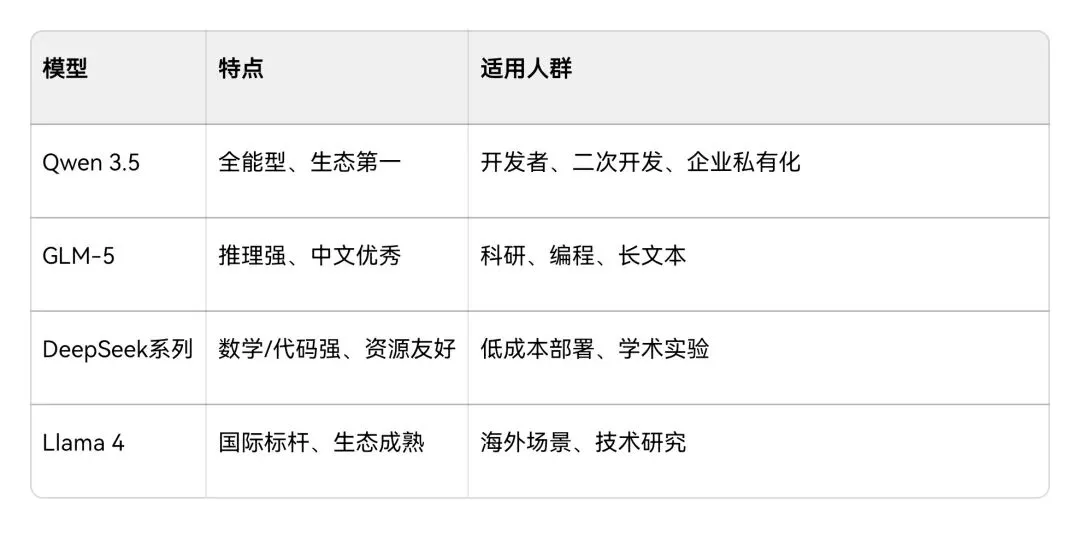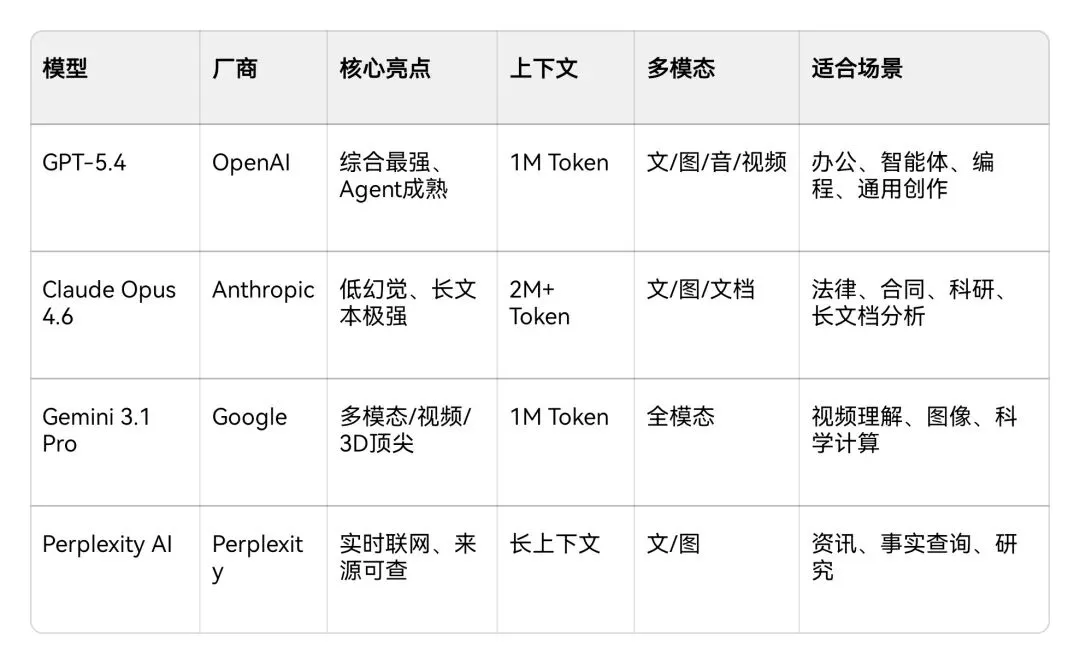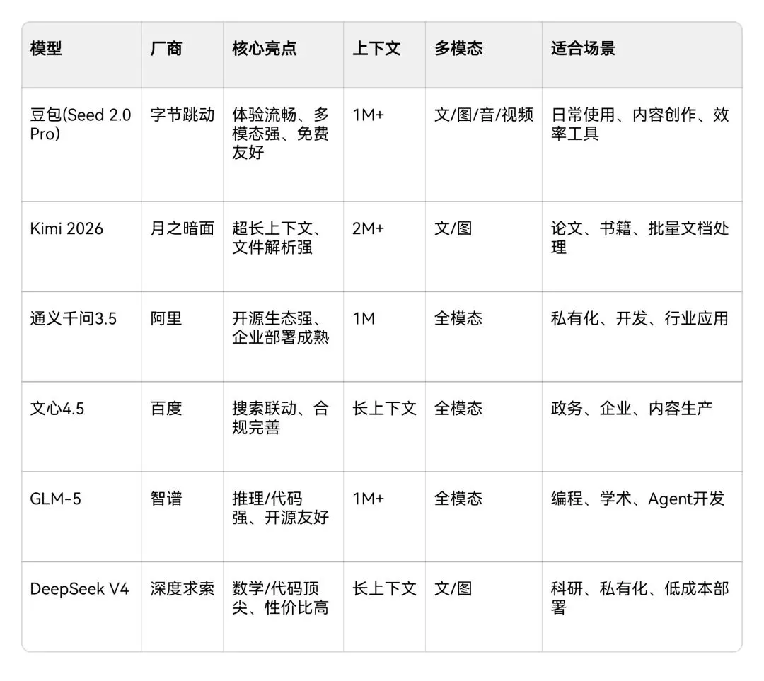 2026 AI 主流大模型工具(国际/国内)精简对比表 一、国际顶层模型 二、国内主流模型 三、开源主力模型(可本地部署) ➮精简指南: △通用高效、日常用:豆包 △长文档/低幻觉:Claude / Kimi △多模态视频:Gemini / 豆包 △编程数学:DeepSeek / GLM-5 △企业私有化:通义千问 / 文心 / DeepSeek △联网查事实:Perplexity