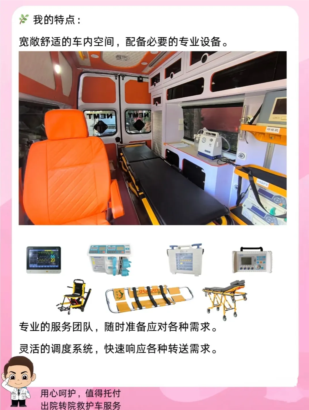 危难之际的托付,重于千金。我们懂您的担忧,更懂生命的重量。我们是正规非急转运公司,救护车出租’长途转运‘跨省转运’市内转运病人服务,针对新生儿,骨折病人,重症病人,危重病人,行动不便者复查,转院,转诊,跨省转运病人回家,承接遗体运送回家服务,我司车辆配有随车专业医护人,确保转运途中病人生命安全