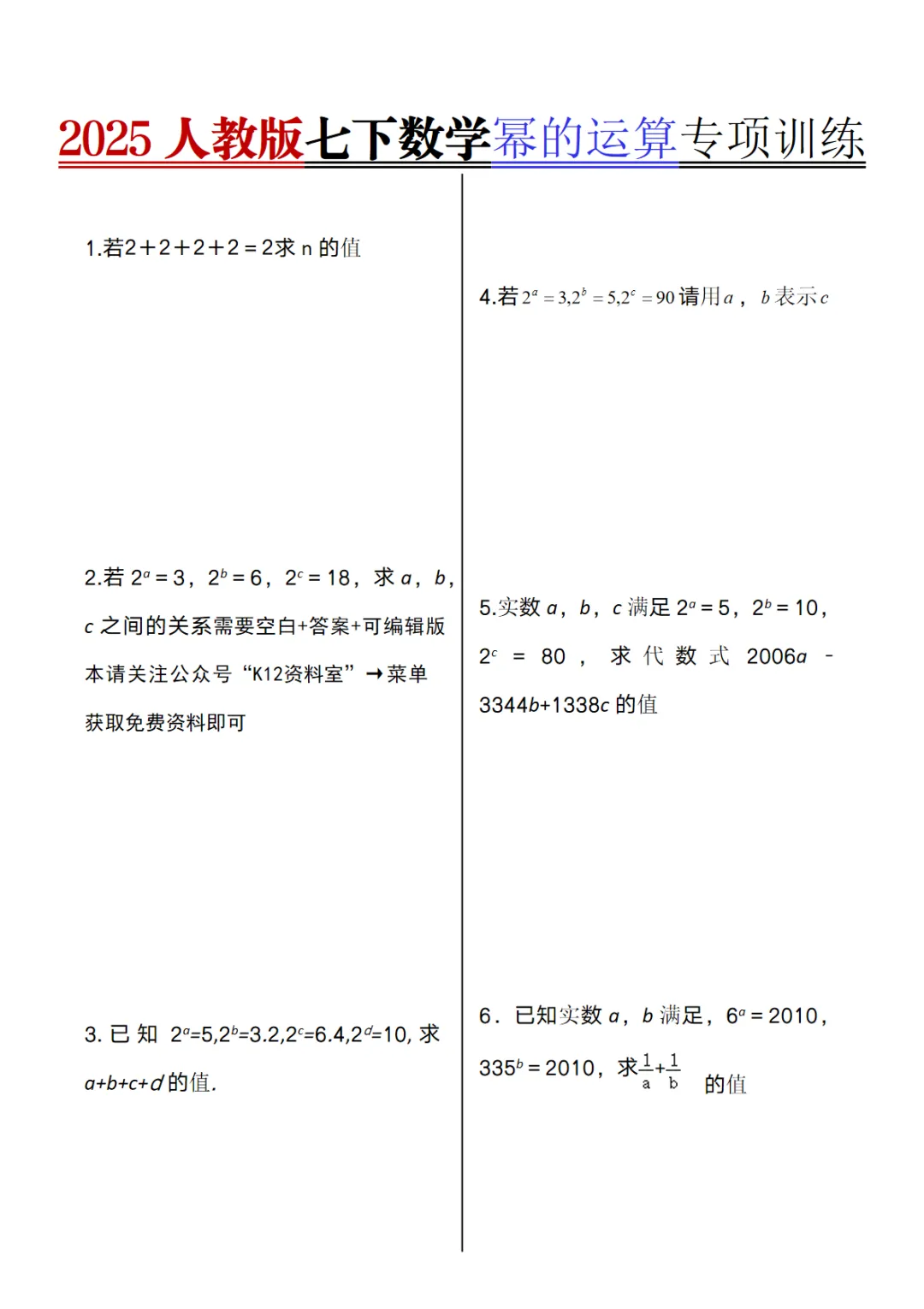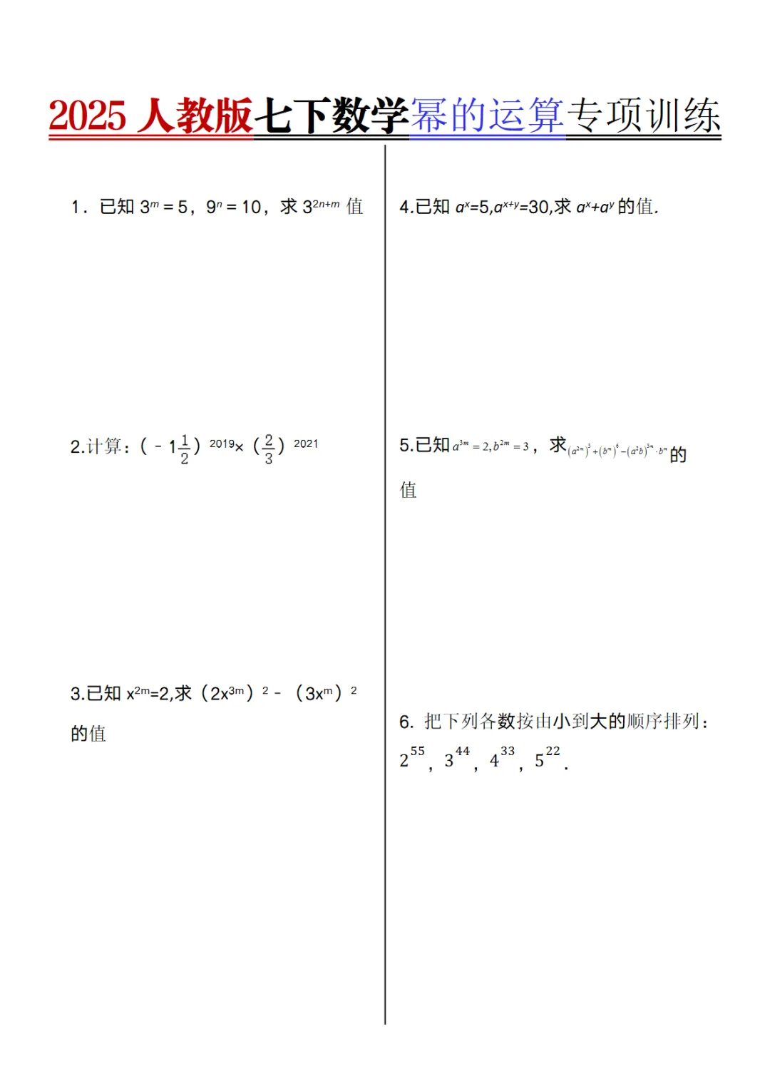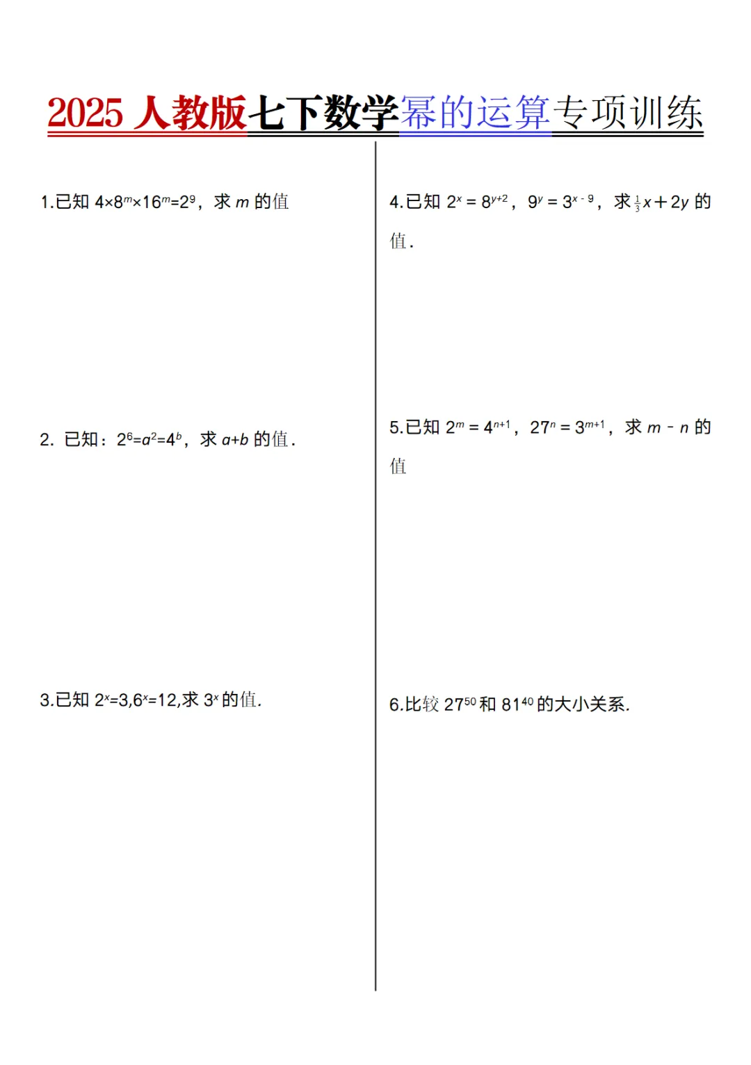 【免费下载】七年级(下)数学 幂的运算专项训练 电子版
