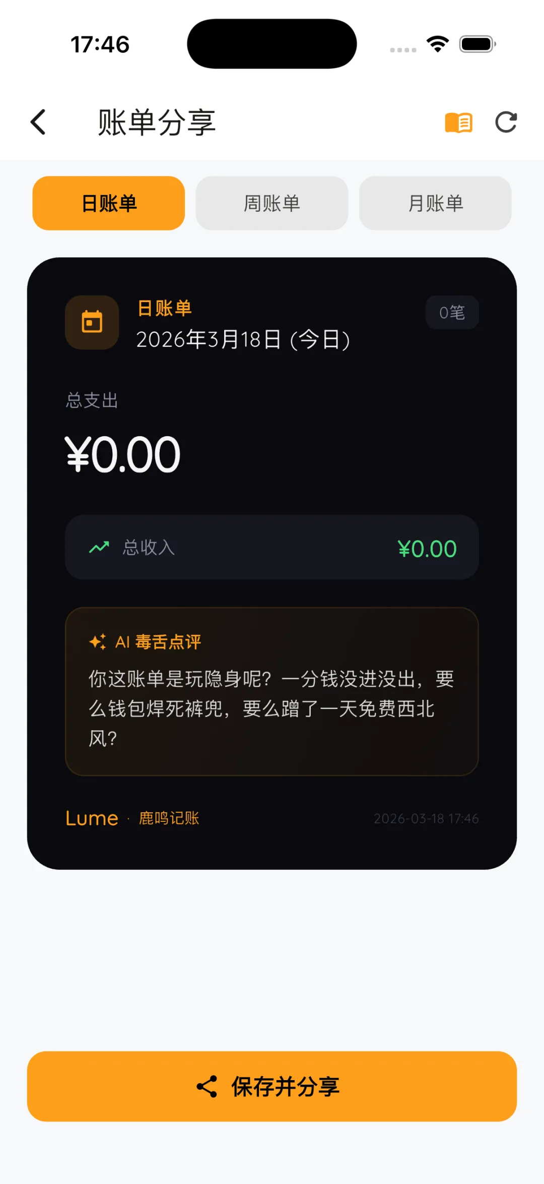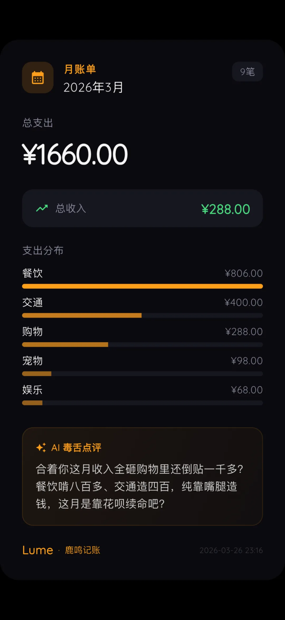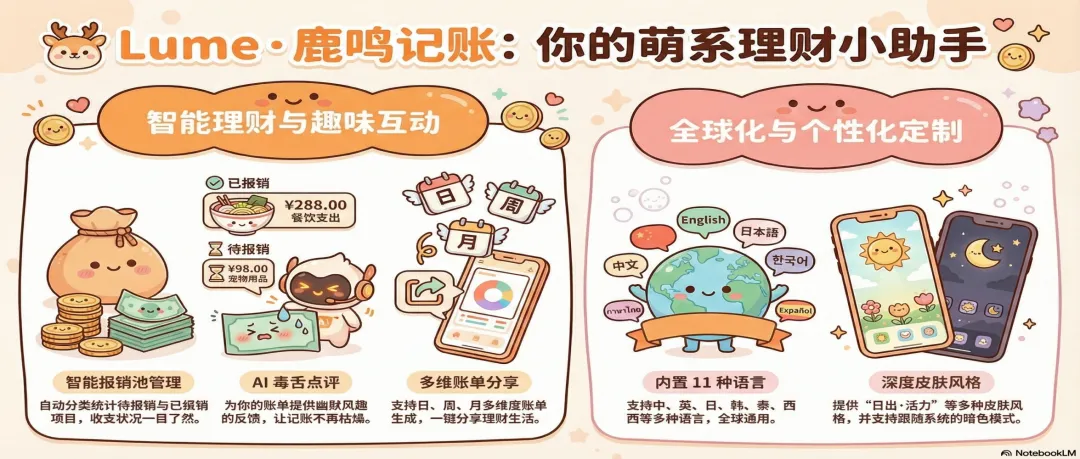 市面上的记账软件大多数是个冷冰冰的统计器。但既然 Lume 接入了强大的 AI,我就不想让它只干“自动分类”这种苦力活。我希望它像一个真正有脾气的“财务助理”。于是,我开发了我自己最喜欢的一个功能——账单分享与 AI 毒舌点评。平时咱们在朋友圈分享账单,就是一张干巴巴的饼图。但在 Lume 里,当你生成每日或每月账单卡片时,AI 会根据你的真实消费数据,给你写一段量身定制的“毒舌吐槽”。比如有一天测试,我生成了一张没有任何消费的“0元日账单”,结果系统毫不客气地甩给我一句:“你这账单是玩隐身呢?一分钱没进没出,要么钱包焊死裤兜,要么蹭了一天免费西北风?”看到这句话的时候,我自己在电脑前笑出了声。有时候,你疯狂网购了,它会嘲讽你是“行走的碎钞机”;有时候你节省了,它又会傲娇地夸你两句。更有意思的是,我还给 Lume 做了 11 国语言的国际化。不管你把手机切成英语、日语还是法语,连这个 AI 的毒舌吐槽,都会自动切换成对应语言来怼你。其实,作为独立开发者,敲代码的过程非常孤独。但在死磕这些细节的过程中:从修好一个信用卡逻辑、到搞定自动报销闭环,再到看着 AI 说出让我捧腹大笑的吐槽,那种把一个作品一点点雕琢出来的成就感,是无法替代的。Lume 并不是市面上功能最庞杂的记账 App,但我敢说,它一定是最懂打工人情绪、最能治愈负债焦虑的那个。目前 Lume 的核心功能已经全部跑通,如果你也受够了繁琐的流水账,想要一个会默默帮你算账、偶尔还会“怼”你两句的极简财务助理,欢迎来找我内测体验。我们下期见!