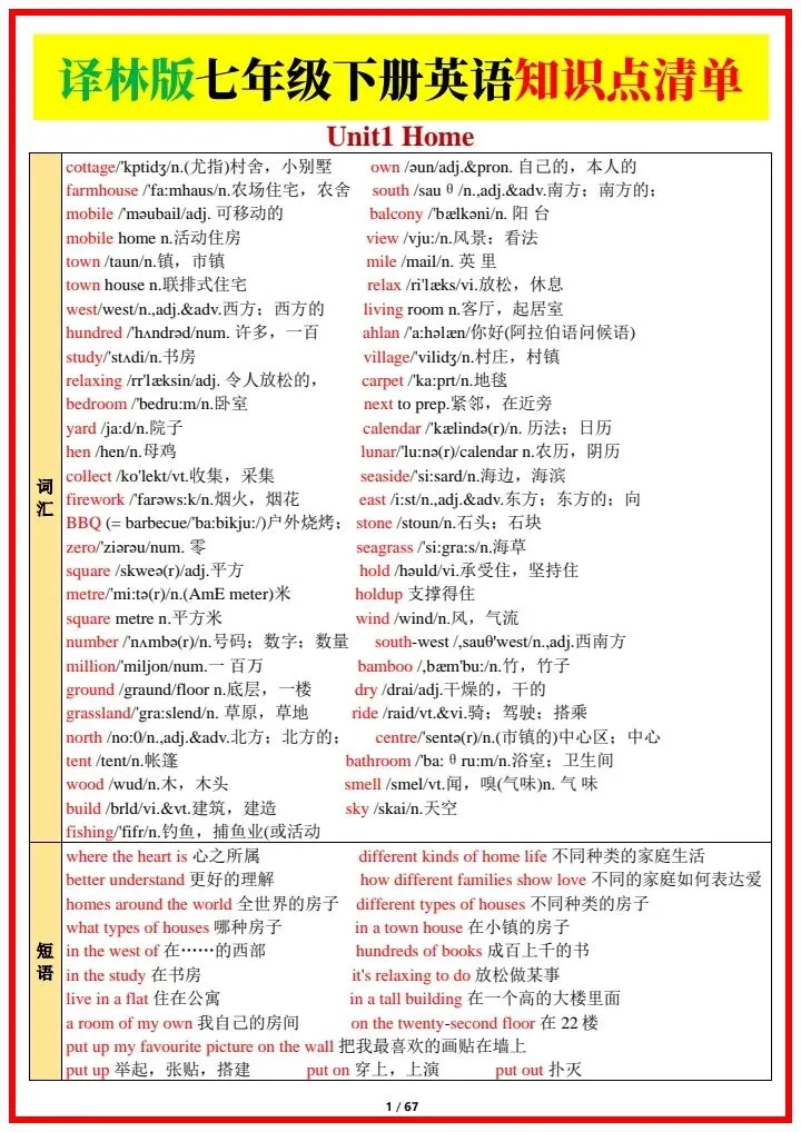 2026春新(译林版)七年级下册《英语》全册知识点总结清单详细版,电子版可下载打印!