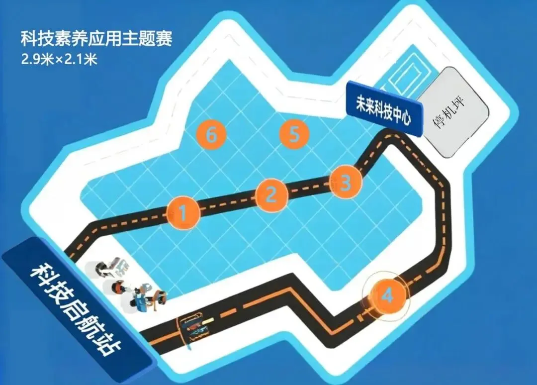 ·起点:标注 “科技启航站”,设置双出发线(左侧机器人巡线起