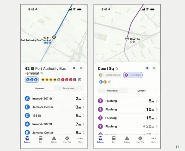 MTA产品负责人Jennifer Chen表示,这款应用是为那些“知道自己要去哪里、也知道怎么去,但只是需要更多一点信息”的乘客设计的。她补充道:“我们是为每天乘坐公交和地铁的纽约人打造这款应用的。”该应用保留了上一版本中的一些熟悉功能,包括状态页面——可显示特定线路的实时到站信息——以及行程规划标签页。用户仍然可以选择特定地铁线路或公交线路作为收藏。Chen表示,在新功能方面,针对地铁乘客,应用新增了车站建模标签,可在具体地铁站内提供路线指引。例如,如果一名乘客希望在相连但彼此独立的时报广场-42街站与港务局客运总站站之间,从R线换乘A线,应用会提示其需要从Broadway与第七大道的交叉口地下步行至第八大道。此外,该应用还会告诉用户在车厢中最佳站位,以及换乘时可接驳线路的到达时间。“换乘是一个非常有趣的问题,因为它既关乎你是否能完成一次完美衔接、带来成就感,也体现了一个真正熟悉地铁系统的纽约人是否知道该站在哪里,才能更靠近出口或换乘点,”Chen表示,“所以我们打造了一个同时解决这两个问题的换乘体验。”该应用还提供无障碍模式,可显示哪些车站配备电梯以及电梯在站内的具体位置。对于公交乘客,该应用允许用户设置个性化地图,显示公交车的实时位置。Chen表示,应用每5秒更新一次公交位置,以提供最准确的信息。Call还表示,今年晚些时候,该应用将整合OMNY非接触支付系统,届时乘客可以在应用中查看余额,并最终通过应用完成支付。