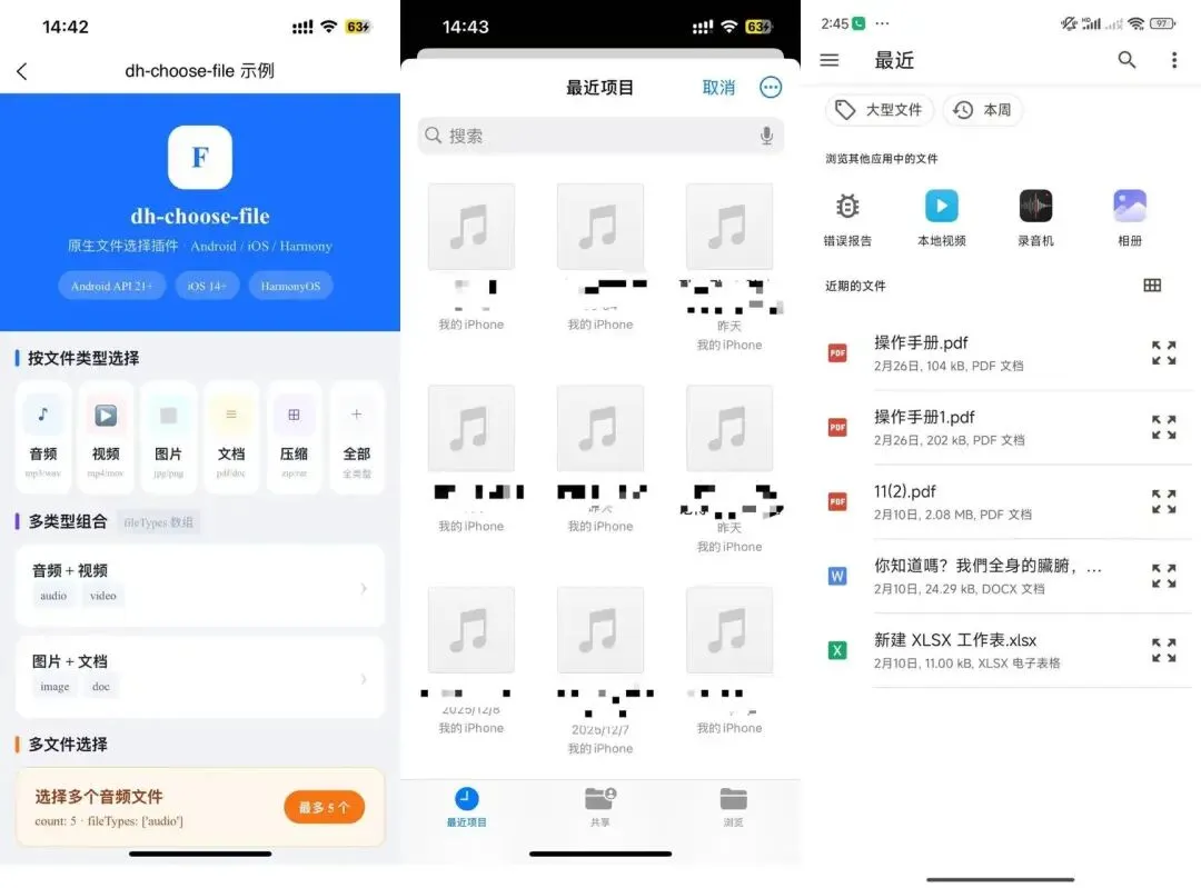 官方描述:支持Android/iOS/HarmonyOS的原生文件选择插件。按类型过滤(音频/视频/图片/文档/文本/压缩包),支持自定义扩展名白名单、多选,返回 路径、文件名、大小、MIME 类型、扩展名。