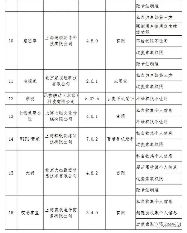 据了解,16款侵害用户权益APP所涉问题包括,私自收集个人信息、私自共享给第三方、超范围收集个人信息、不给权限不让用、强制用户使用定向推送功能、账号注销难等。