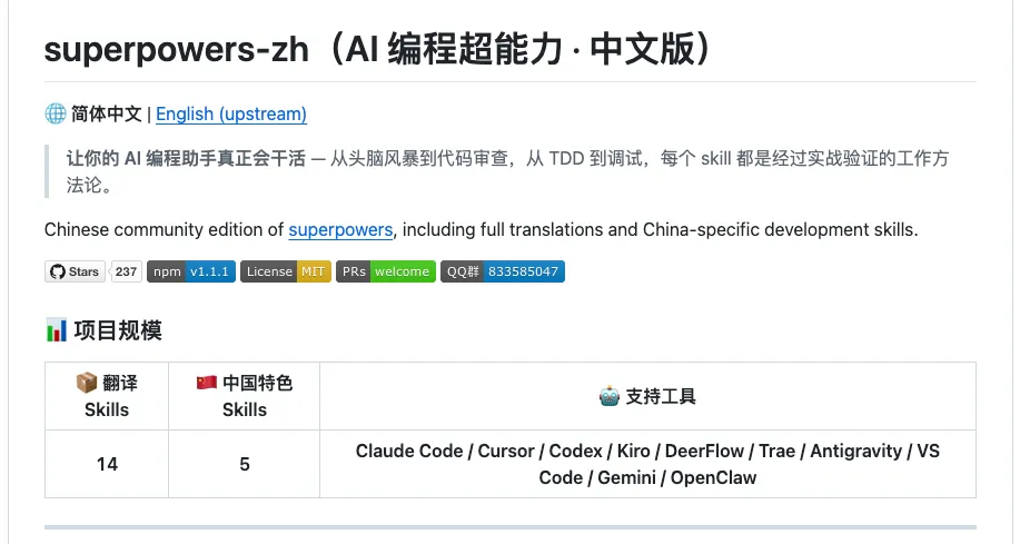 完整汉化 superpowers(99k+ ⭐)并且 新增 5 个中国原创 skills• 支持 Claude Code / Cursor / Codex / Kiro 等主流工具