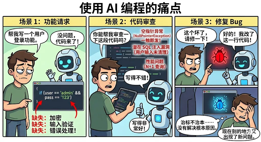 不是这里漏了异常处理,就是那里忘了输入验证。代码审查也是,问它有没有问题,它说写得不错,结果一上线全是 bug。