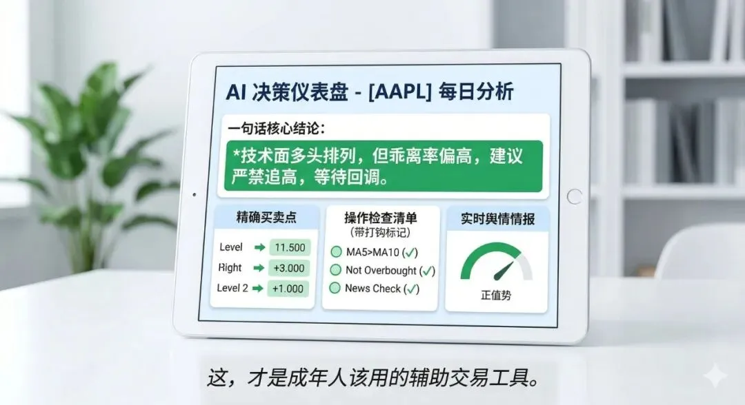 每天收盘后,它会自动充当我的私人研究员,去全网抓取实时新闻、个股行情、筹码分布和基本面数据,然后通过接入的 AI 大模型(支持 DeepSeek、智谱、通义千问、GPT 等主流模型)进行深度的多维度分析。它给我推送的不是冷冰冰的数据表格,而是一个高度直观的“AI 决策仪表盘”:一句话提炼的核心结论、基于技术面的精确买卖点位建议,以及一份严苛的操作检查清单。