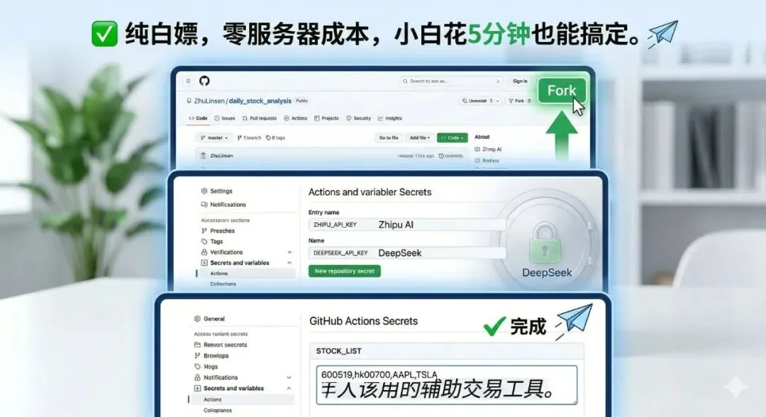 完全不需要!这也是这个项目最打动我的一点:纯白嫖,零服务器成本,花 5 分钟也能搞定。它巧妙地利用了 GitHub 自带的自动化工具(Actions)提供免费算力。你只需要跟着我做这简单的三步,就能立刻拥有这个 24 小时为你待命的 AI 投资助理: