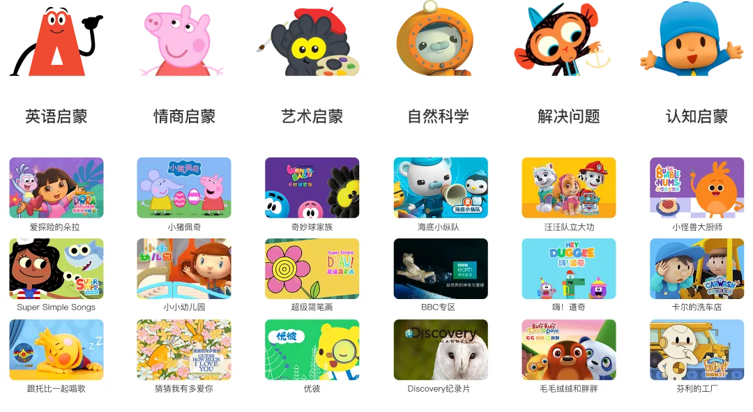 英文儿歌、动画、电影应有尽有,从《Super Simple Songs》到《Peppa Pig》,全覆盖。