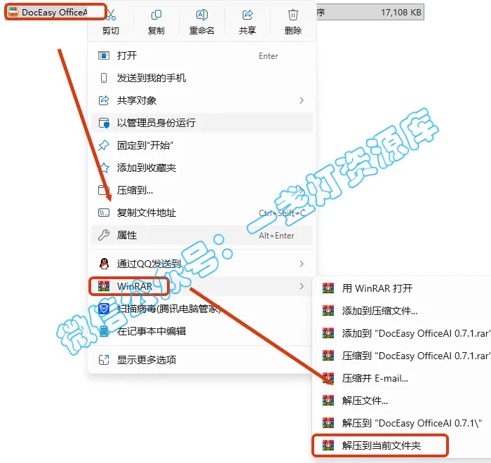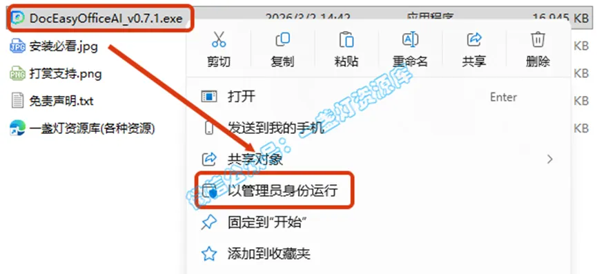2.打开刚刚解压的文件夹,鼠标右键点击【DocEasyOfficeAI_v0.7.1.exe】选择【以管理员身份运行】