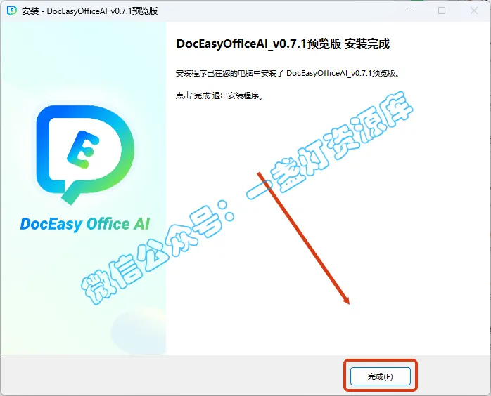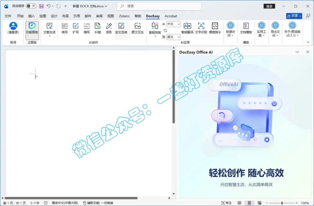 11安装完成,直接打开Office或者WPS,点击【DocEasy】,右侧也多出了AI助手,通过微信登录即可免费使用所有功能