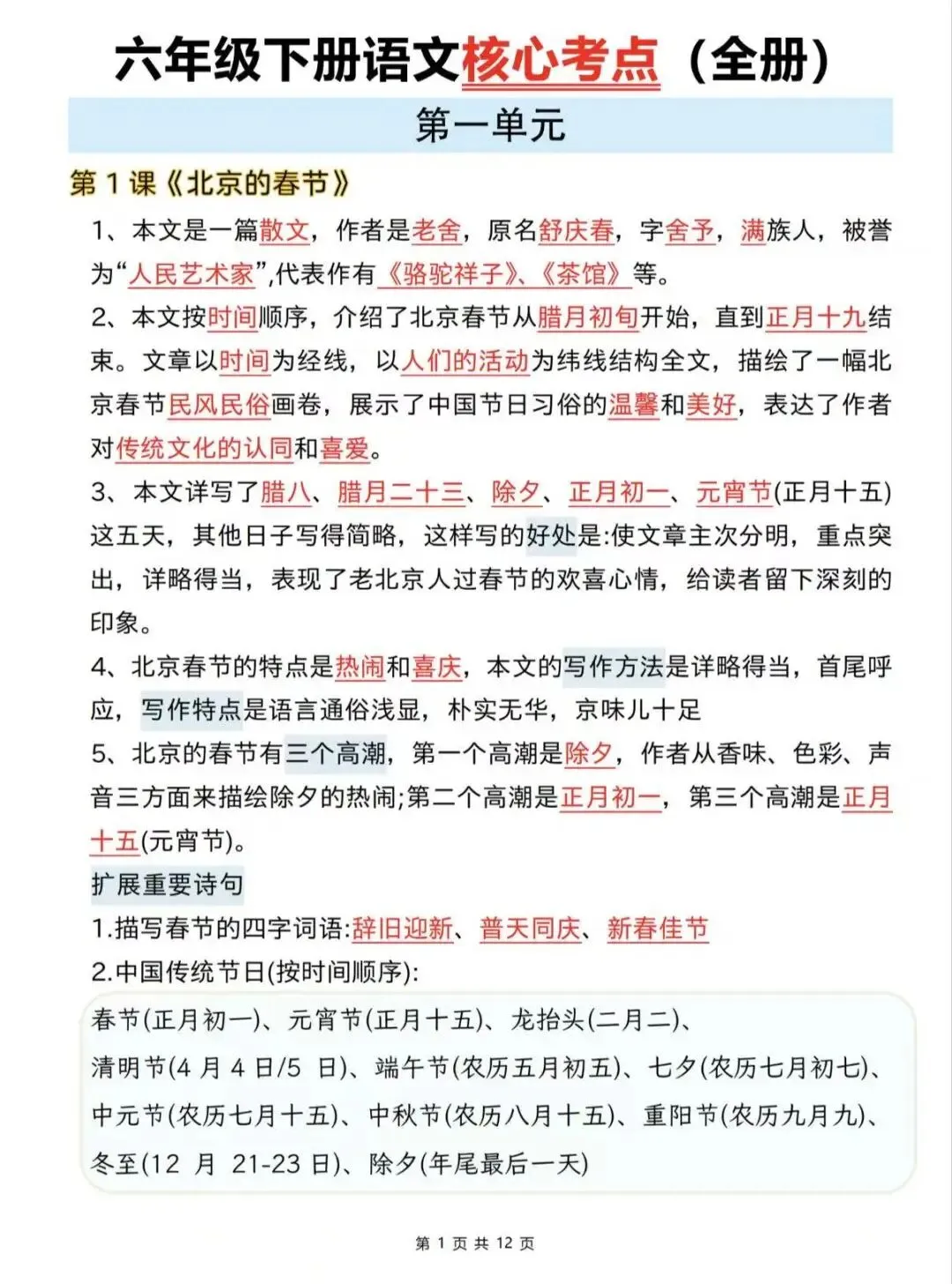 大家好我是白菜学库;今天跟大家分享的是;26春最新版六年级下册语文1-6单元《核心常考点知识速记》期中期末复习必背,提供电子版,支持打印和下载。