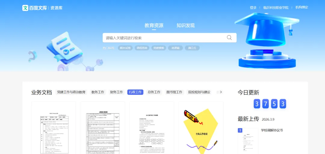 2、校外使用,先在校内登录百度文库高校版,登录个人百度账号,点击右上角机构绑定,输入邀请码点击确定,完成绑定。教师端邀请码:P66EUE3T。