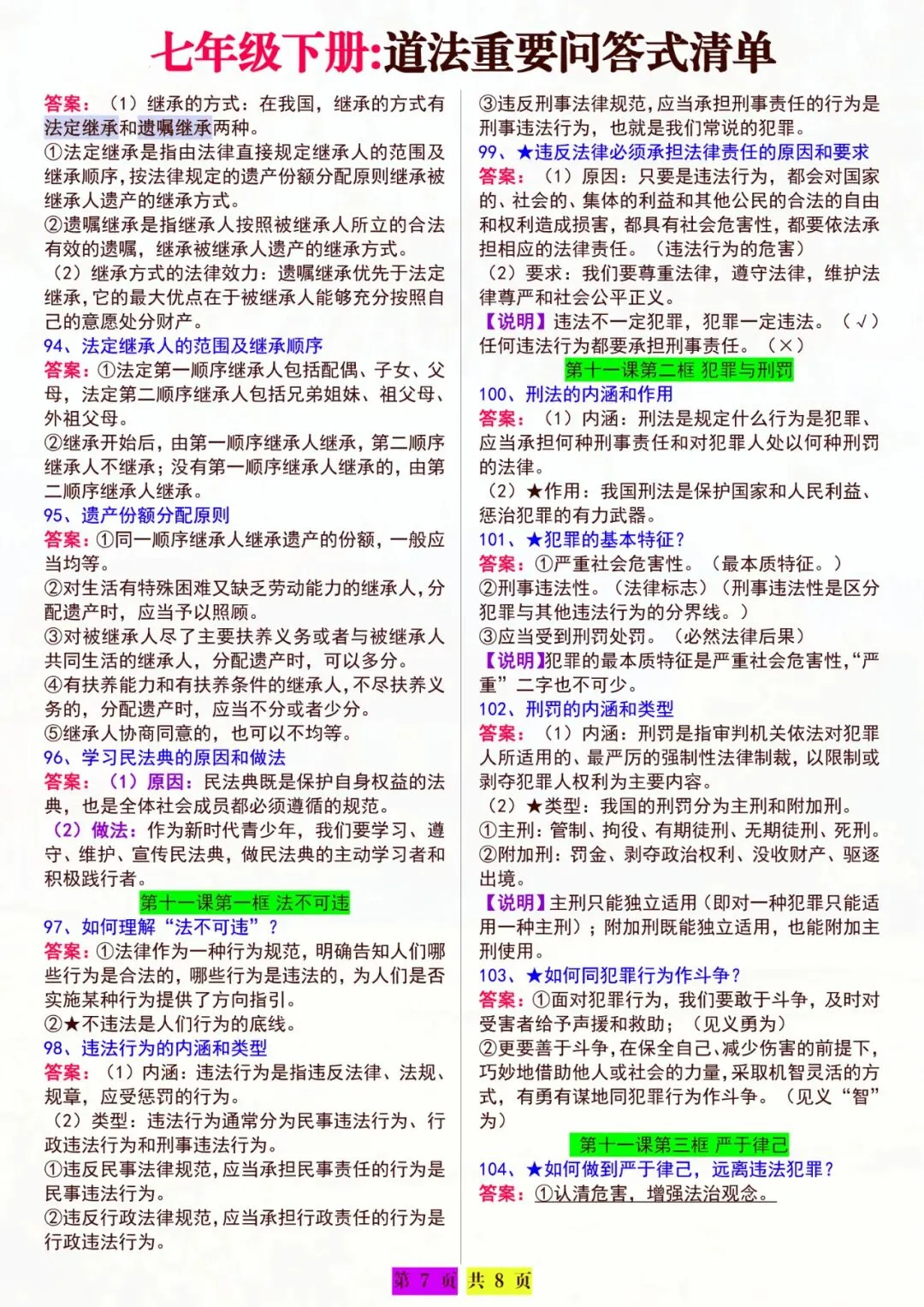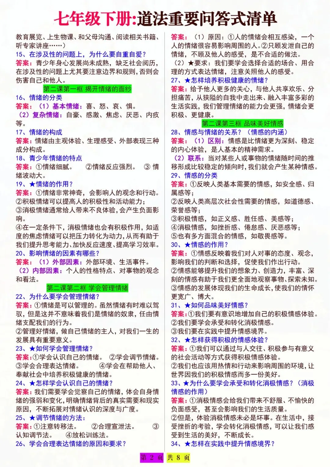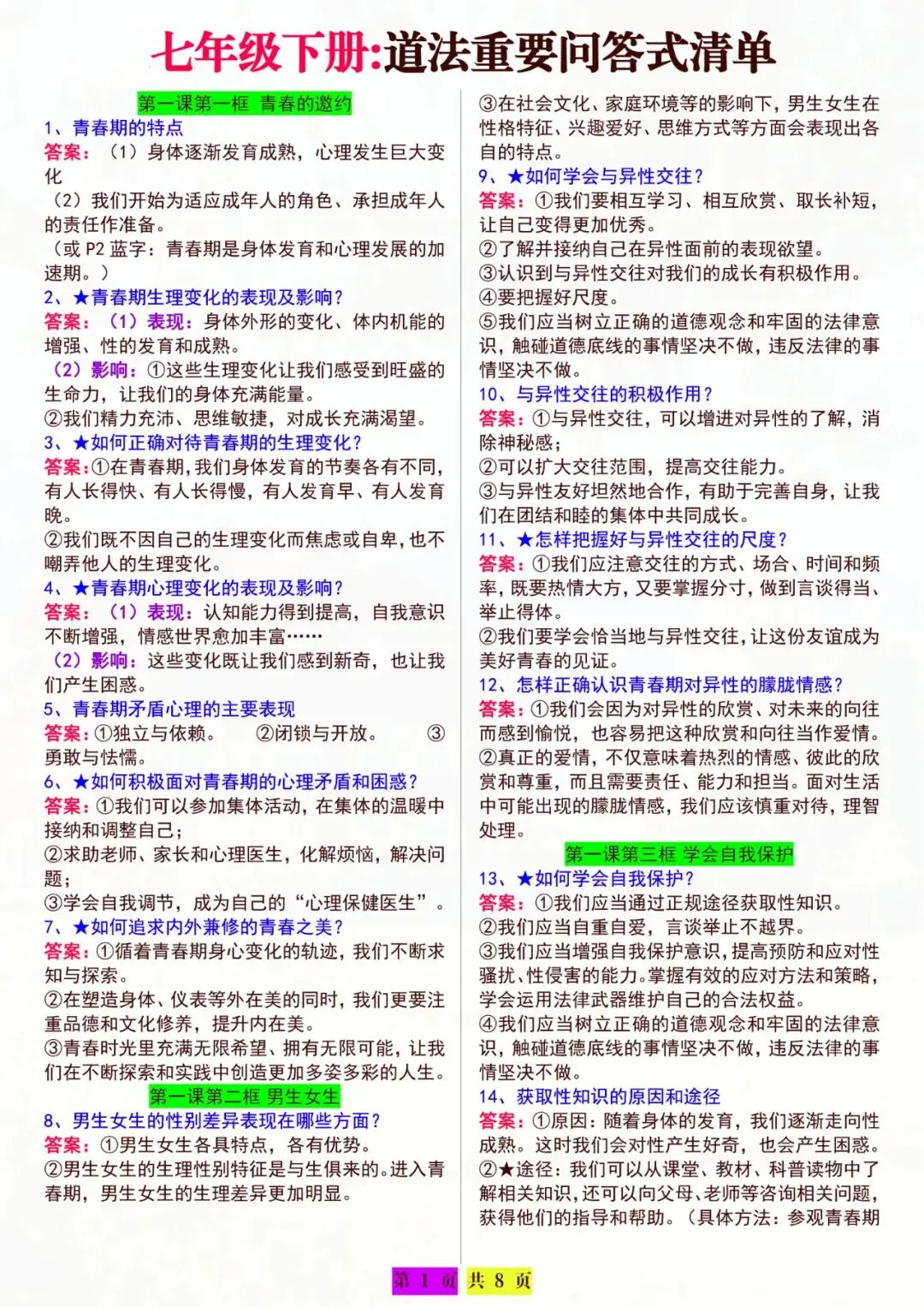 七年级下册道法|重要问答清单 电子版可打印