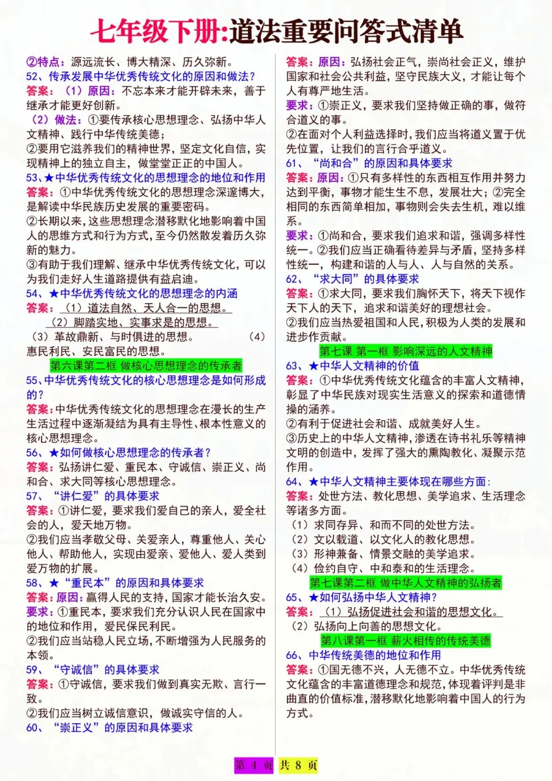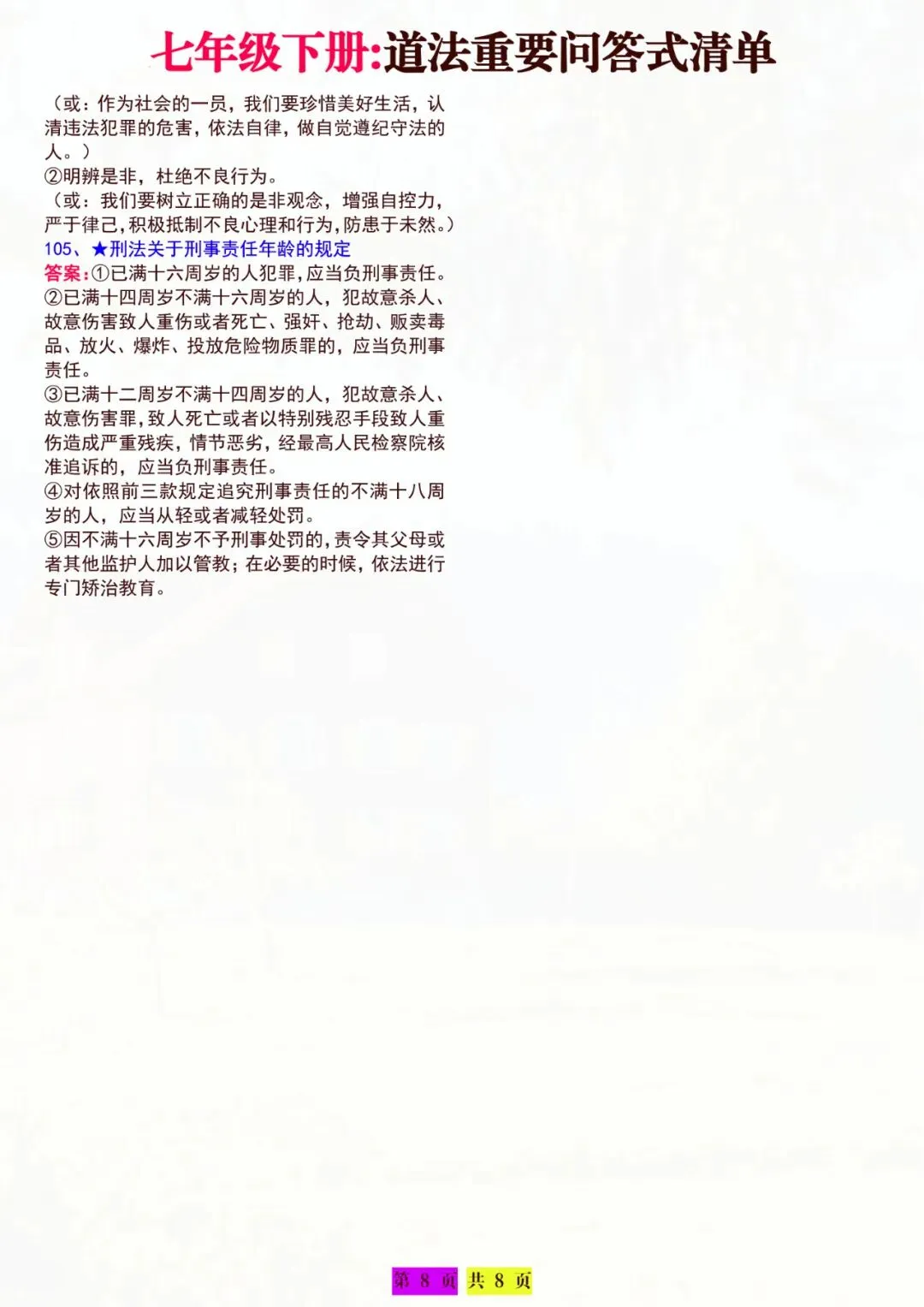 今天老师为大家全部整理好了:七年级下册道法|重要问答清单 电子版可打印!