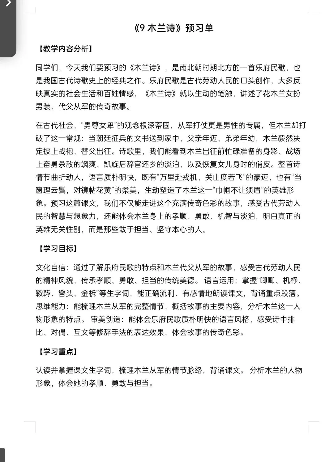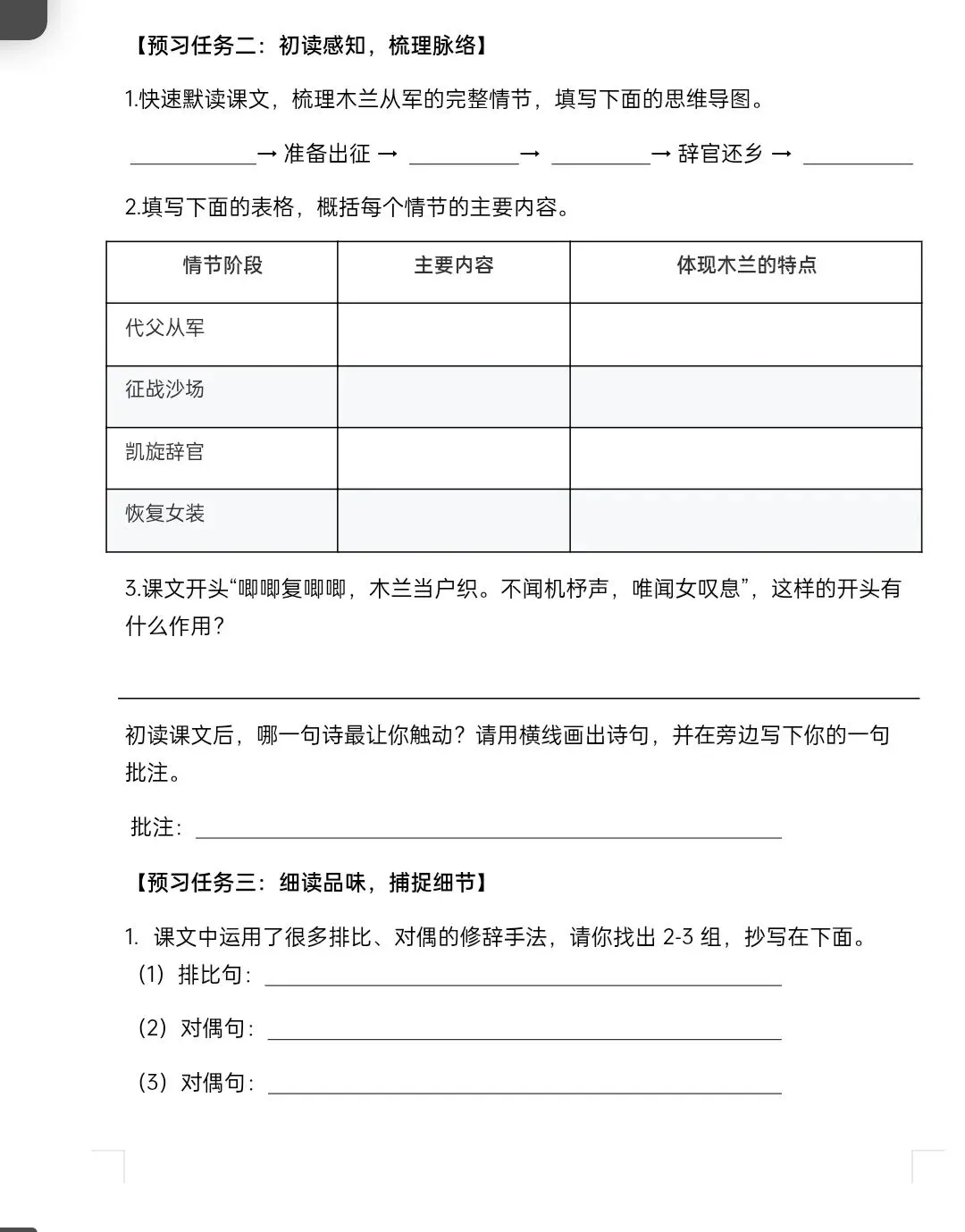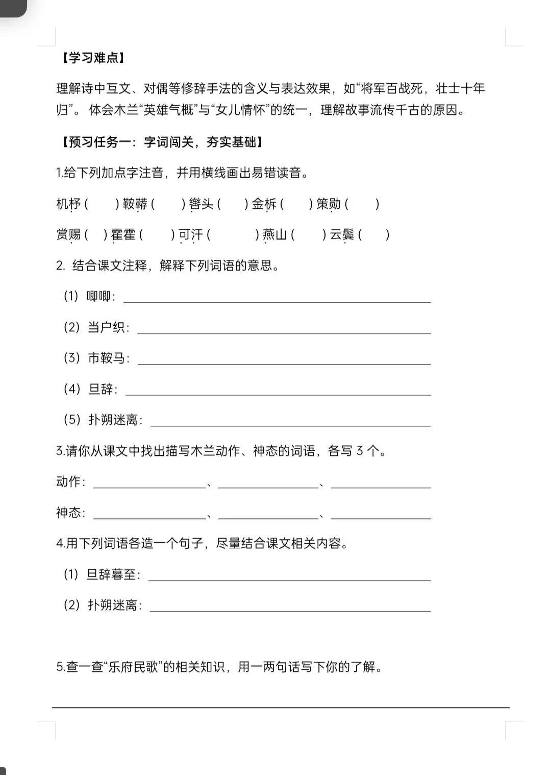 今日分享:七年级下册语文《木兰诗预习单》含答案 电子版可打印,拉至文末可直接领取完整电子版