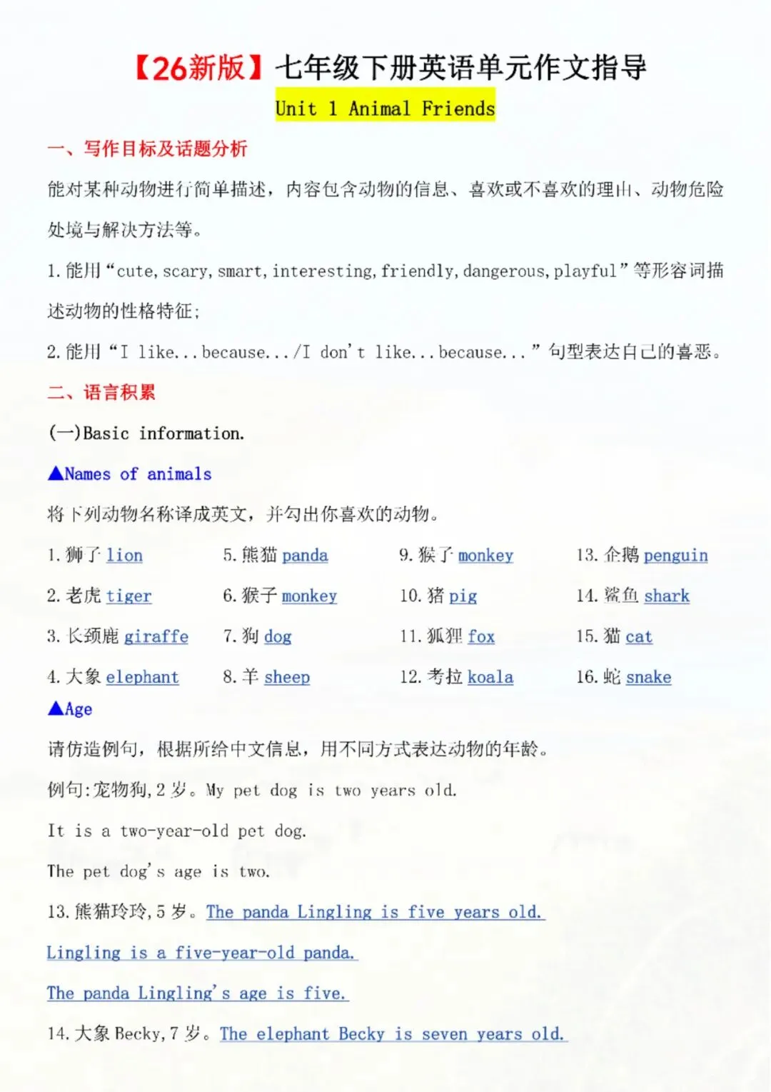 今日老师为大家整理了:七年级下册英语单元作文指导 高分范文 电子版可打印