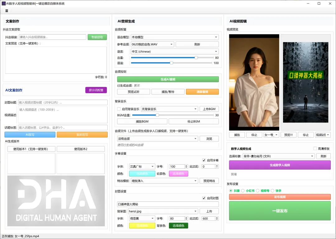 全部搞完之后,可以直接一键发布到抖音、小红书、视频号和快手。整个流程,从输入主题到视频上线,**全自动,零人工干预**。