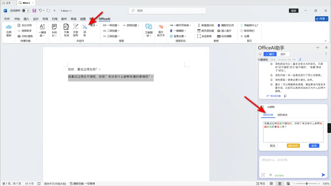 它有个润色功能很好用,你写一段话,然后点【润色】,支持文案改写、错句词审阅修订、长文本校对: